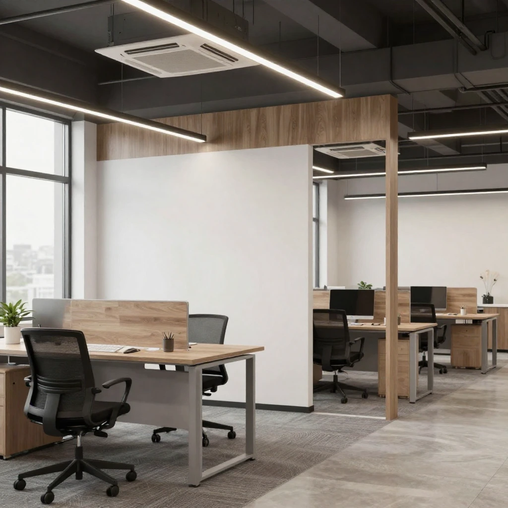 A complete office upgrade. We tore out the old layout to add fresh finishes and modern lighting.